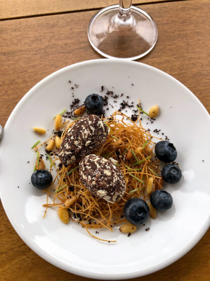 Chocolate truffle eggs in a phyllo nest with Sitka spruce tip syrup. An exuberant and joyful desert.