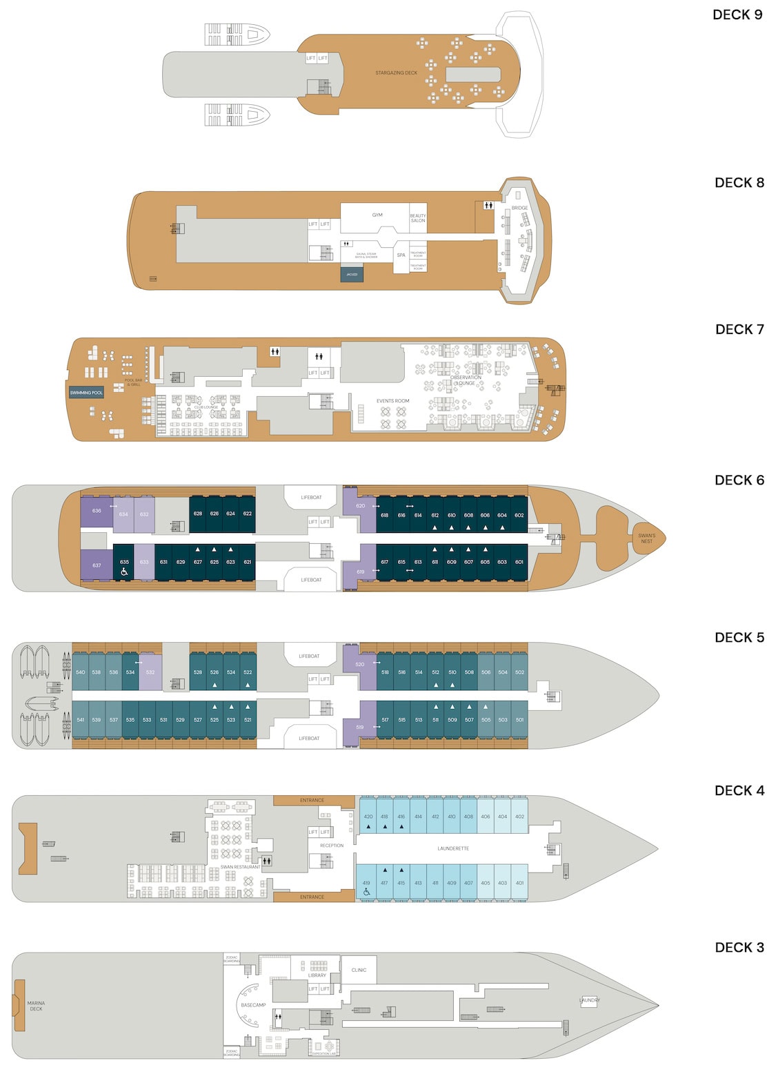 The recently constructed Diana is a new-generation expedition cruise ship. Although large enough to accommodate more than 250 passengers, the Diana carries just 192 passengers in spacious outside-facing staterooms and balcony suites, resulting in one of the most generous space-to-guest ratios among cruise ships. Her PC5 Category A ice-strengthened hull and other technical and mechanical attributes allow the ship to cruise the world’s remote regions in safety and utmost comfort. Operated by a complement of 140 experienced officers and crew members, the Diana is equipped with a fleet of Zodiacs, kayaks, and a remotely operated underwater vehicle (ROV) that reveals the marine life of the deep. Public areas include several lounges; a restaurant that accommodates all guests at one seating; an outdoor café/bar that surrounds the heated swimming pool; a wellness facility with a gym, spa, and sauna that includes an adjoining outdoor Jacuzzi; library; beauty salon; and an infirmary that is attended by a resident medical doctor and nurse.