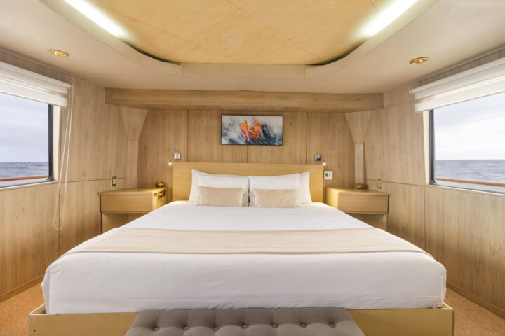 If you want to experience the Galápagos in supreme comfort, a cruise aboard the 14-guest Passion is the way to go! Originally a private family yacht, she has been adapted for cruising the Galápagos in chic, sophisticated style. The original name of the Passion was Bellissima (“gorgeous” in Italian), and with one step aboard, you'll soon see why. Incredibly spacious public areas include a panoramic sky lounge and bar, and nearly 2,000 square feet of wonderful teakwood decks with multiple places to lounge, including a secluded sundeck with an inviting hot tub. Gourmet meals are served in the formal dining room or outdoors on the upper deck—al fresco dining is one of the delights of traveling by boat. While the yacht is fully air-conditioned throughout, each of the seven cabins offer individually controlled air-conditioning and en suite bathroom with bathtub and hot shower (stateroom 5 has shower only), hair dryer, and USB charger. Of the five standard staterooms, two feature queen beds, one two twin beds, while two others offer one full and one twin bed each. The two luxurious suites have a king size bed and his-and-hers bathrooms in rose-colored marble. Stabilizers minimize motion at sea so you can enjoy a most comfortable ride. And with a 1:1 passenger-to-crew ratio, you're ensured of first-class service throughout your cruise.
