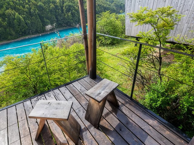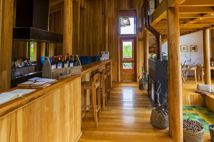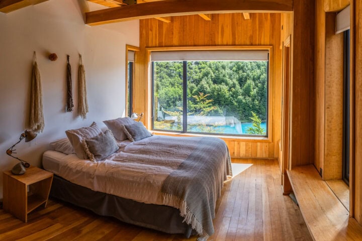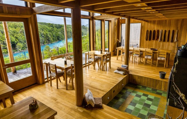 The seven modern chalet-cabins at the BordeBaker Lodge are cozy and comfortable, each with a wood-burning stove, floor-to-ceiling windows, and a small balcony with fantastic views over the turquoise Baker River. The cabins are connected to the main lodge by wooden walkways. The restaurant in the main lodge offers excellent meals sourced from local farms and gardens.