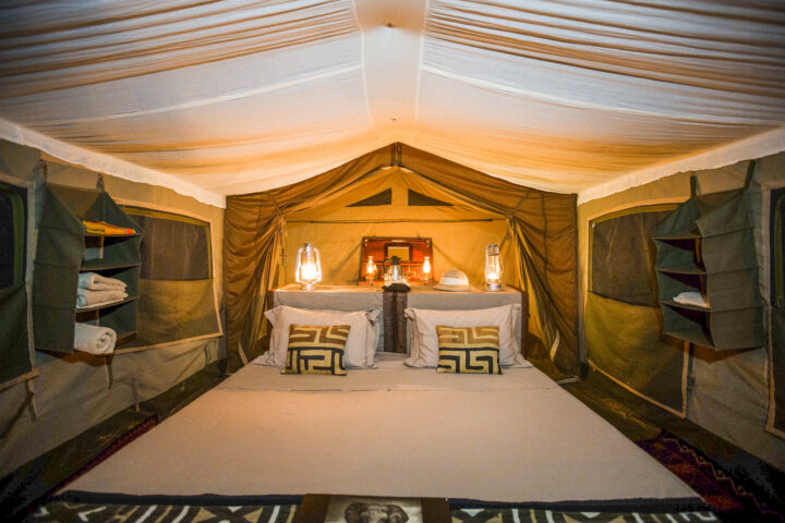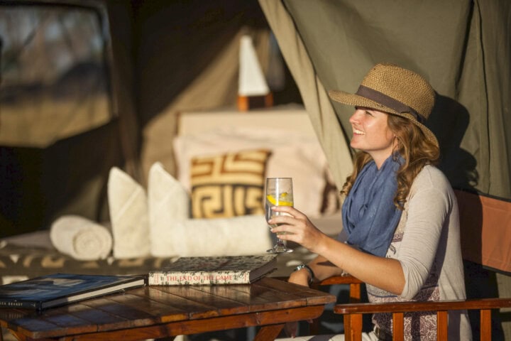 Our private safari camps, set up for our groups alone, put you in the prime spot for phenomenal game viewing and direct access to pristine sections of the parks. You'll camp in a wonderful variety of locations, all far from the lodges, and be surrounded by Botswana's most magnificent terrain in absolute comfort. You'll enjoy meals in our big open-sided dining tent, and in the evenings, gather around the campfire beneath a starry sky. Our spacious private tents feature real beds (no cots!), private bathroom and shower.