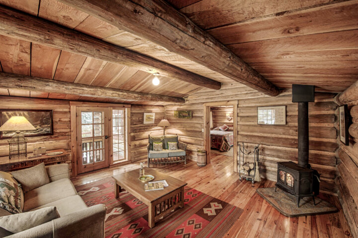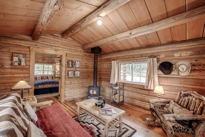 Located in a remote and beautiful setting outside Jackson Hole, Flat Creek Ranch offers five "rustic luxury" log cabins with creekside or lake views, antique claw-foot bathtubs, and wood-burning stoves. The historic cabins are well appointed, clean, and comfortable but not necessarily fancy. The main lodge, with its front porch overlooking a lake, has a large living room anchored by a stone fireplace and a piano. The lodge's kitchen is supplied with local, organic meat and produce whenever possible, including fresh greens from the garden. Half-day horseback trail rides are offered on rugged mountain trails, and fly fishing and hiking are equally popular activities.