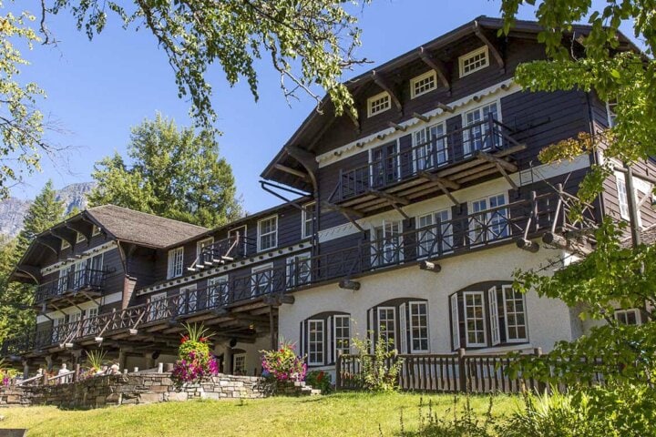 Historic Lake McDonald Lodge, built in 1913, is located right inside Glacier National Park, nestled on the shores of the largest lake in the park and just 10 miles from the west entrance. There are 82 guest rooms in the three-story main lodge, whose grand lobby extends to the third floor, replete with a massive fireplace and flagstone floor. It was designated a National Historic Landmark in 1987. Guest rooms are rustic, yet comfortable, with modest amenities. Televisions, air conditioning, and elevators are not available, and the WiFi signal is spotty, but the lodge has a truly spectacular lakeside location.