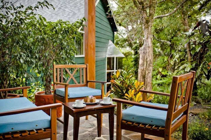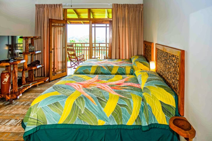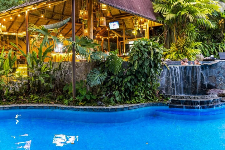 This wonderful resort is like an oasis in the middle of nowhere. While the rooms are not luxurious, they are very comfortable and private, and feature balconies with fantastic views of Arenal Volcano (assuming clear weather). An open-air restaurant serves delicious meals (try the ceviche and tilapia dishes) and the free in-room Wi-Fi is a plus. There are also beautiful gardens, a spectacular double pool with swim-up bar, and if you have some extra time, treat yourself to a soothing spa treatment.