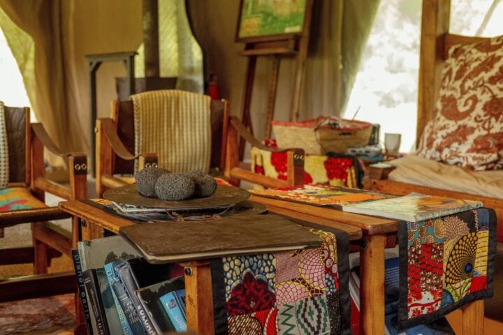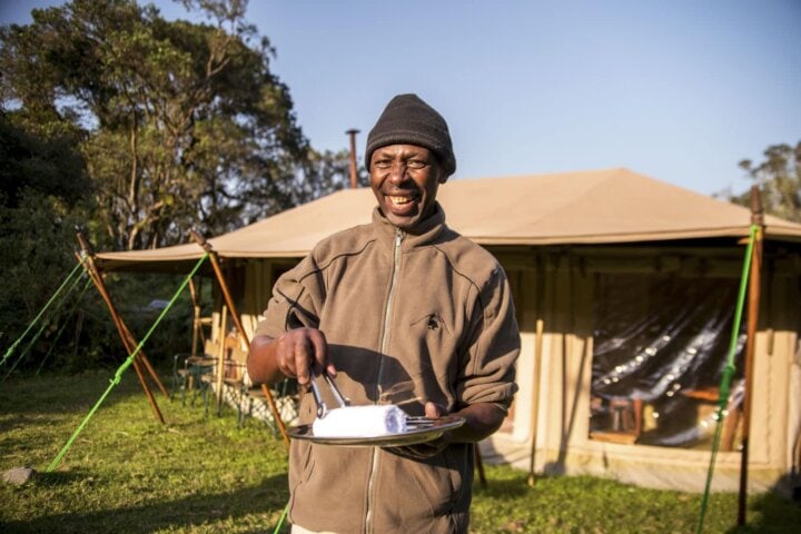 Mount Meru Camp, set at nearly 6,500 feet in the ancient montane forest on the slopes of Mount Meru, is a fantastic, off-the-beaten-track hideaway and the perfect jumping off point for our Kilimanjaro climb. Each tent features wood framed beds, an en suite bathroom with a bucket-type shower and flush toilet, a small private veranda with chairs and a washstand, and solar powered lighting. A lounge tent, set in an open glade, has a wide veranda to keep it cool during the heat of the day, and a separate mess tent serves wonderful food created by our resident chef over an open fire (a specialty is barbecued meat and vegetable kebabs). Mount Meru Camp is great for acclimatization, and the two nights sleeping at 6,500' give you the head start that will help you get to the summit of Kilimanjaro.