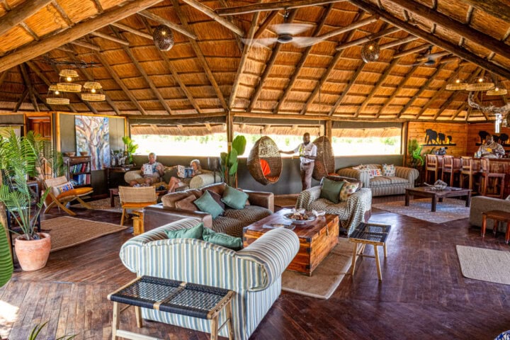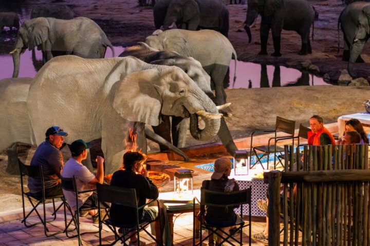 Raised thatched tent chalets arcing around a watering hole make Nehimba Lodge a spectacular place to witness elephants and other animals drink and play in northern Hwange National Park. Whether you come during the green or dry season, Nehimba's location within the park offers fantastic opportunities to view a wide variety of birdlife like giant eagle owl, Burchell's sandgrouse, and red-billed francolin, and possibly see the famous elephant hunting lions that prowl this part of the park. Private, enclosed outdoor showers are attached to each chalet, and all have beautiful open-beam thatched ceilings and verandas overlooking the watering hole. For a refreshing dip, relax at the lodge's pool, and with luck, have an up-close encounter with elephants—they're known to come right up to the pool's edge!