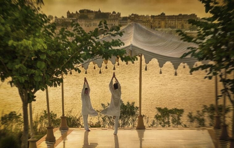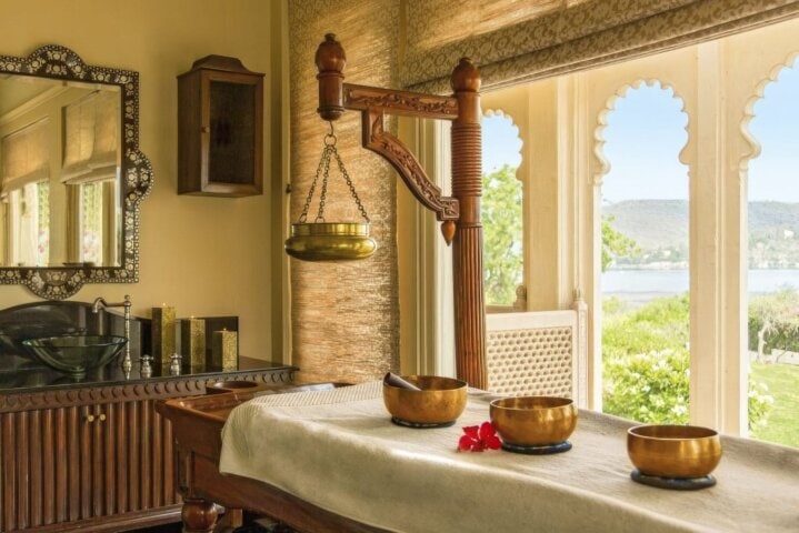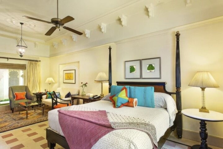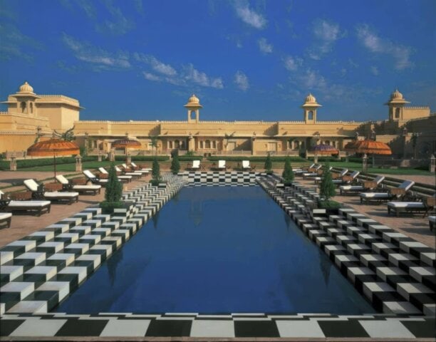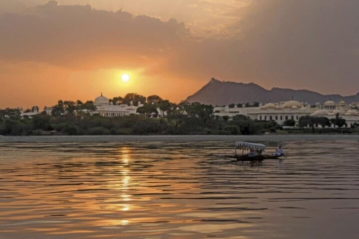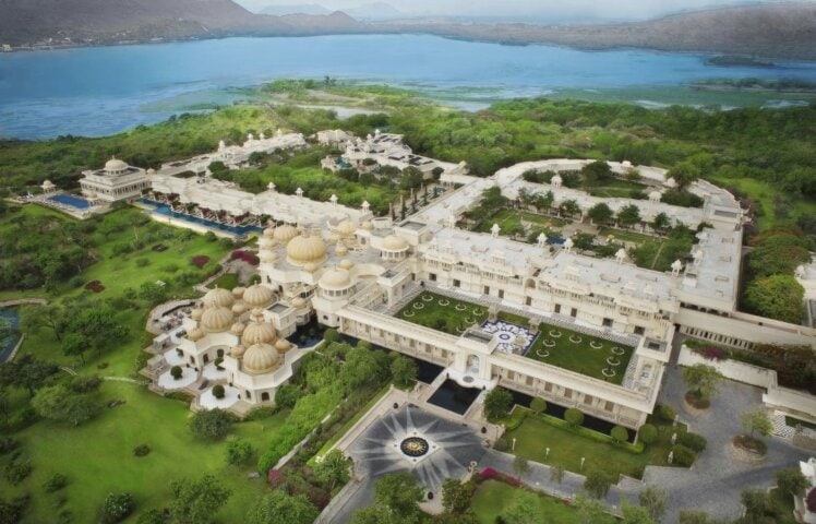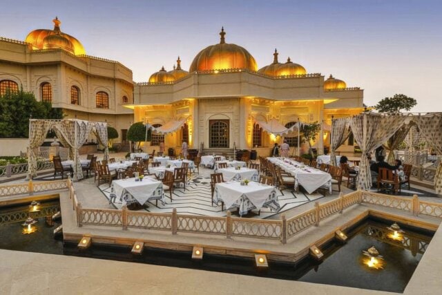 Built of sandstone and marble in grand Mughul style, this dramatic new hotel on Lake Pichola offers a royal ambiance with graceful domes, intricate tile flooring, grand staircases, Rajasthani artifacts, cascading gardens, and views of Lake Pichola. The swimming pools and spa are beautiful, and the staff is courteous. The Udaivilas' bar is very welcoming—after a day of exploring the old city, stop in and relax with a cocktail and some fresh warm cashews.