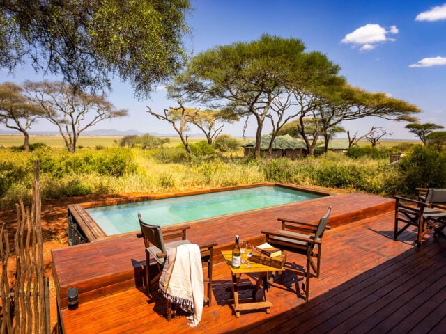 Set beneath mature acacia trees and facing the rising sun, Osunyai offers all the creature comforts of a seasonal camp, while retaining the relaxed casual feel of a mobile camp. Luxury safari tents are set to maximize the view in front of camp, where game meanders in search of grazing. The tents are large and airy with full-width windows and en suite bathrooms, king-size double or two extra long single beds, hanging wardrobe, luggage racks, and interior solar light tables. Each has a private veranda. A very large tent forms the nucleus of the camp, an ideal spot to relax and enjoy the tranquil ambiance. In the dining area, you can enjoy delicious meals, sample wines from South Africa and beers from the region, as well as the normal selection of soft drinks, juices, and spirits.