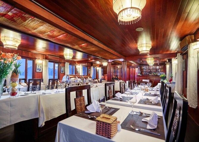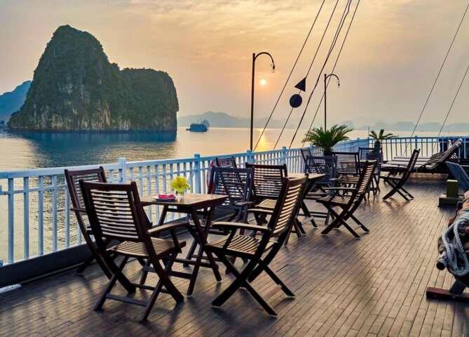 Traveling aboard a private junk (motor-sailer) in Halong Bay and Bai Tu Long Bay is a wonderful way to capture the evening and early morning vistas of this magnificent World Heritage Site. Our modern boat is constructed of teak and bassia wood to resemble the centuries-old Chinese style, with its flat bottom and high stern. Cabins typically have outward-facing windows, with twin or queen beds, fans, as well as air-conditioning, and private bathrooms. Multiple-course meals are served. Our junks are staffed by a small crew, including a private chef. While this is a sailing vessel, it will travel by motor in order to cover the distances needed. Please note: The boat we charter for each departure varies due to availability, but they are all of similar high quality.