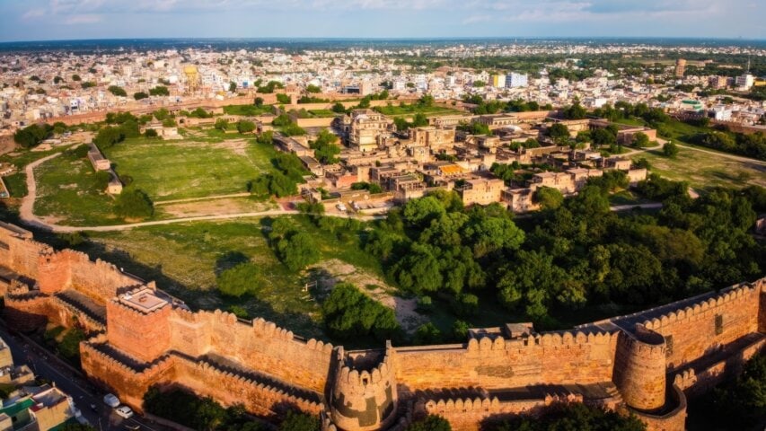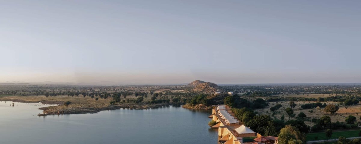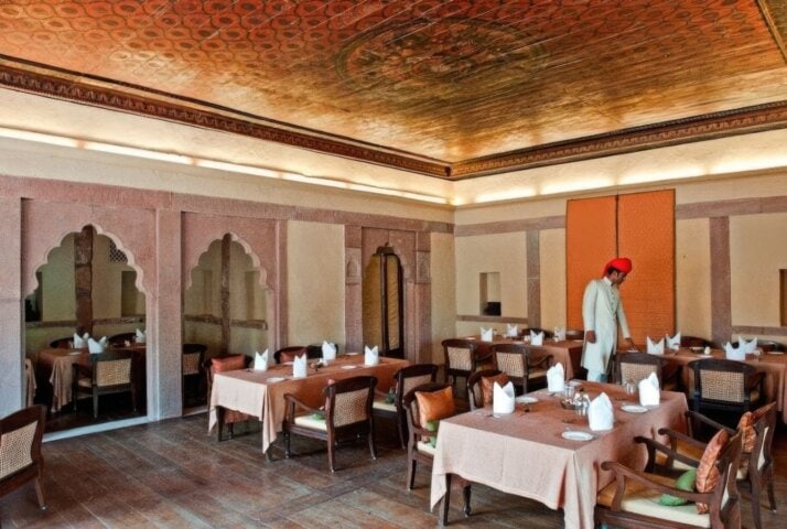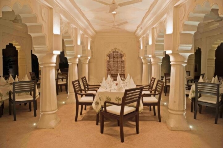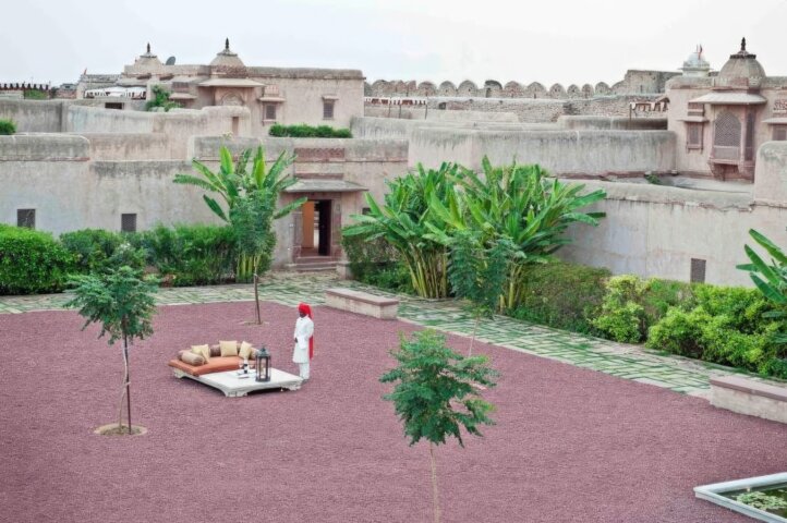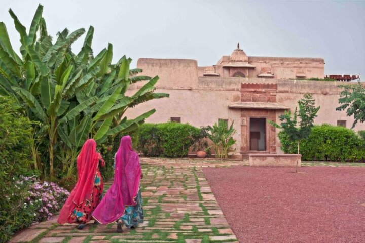 Ranvas (“Abode of Queens”) is a stunning new heritage hotel built in the heart of an ancient fort on the edge of the Thar Desert. The massive fortress has been restored to its former glory through the efforts of the Maharaja of Jodhpur, and the hotel is set within the ramparts. This atmospheric accommodation offers a step back in time—but with tasteful modern rooms that blend beautifully with the stunning architecture of the fort. Dining outside in the pavilion under billowing awnings is a delightful experience.