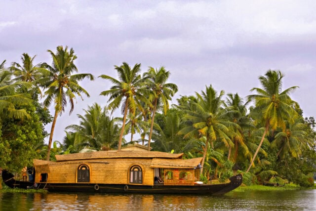 The beautiful houseboats of Kerala, called kettuvallams, were once used to transport rice, spices, and other goods to the port of Kochi. Today these delightful 80-foot barges make fantastic overnight accommodations for a journey along the lagoons of Kerala. The private, air-conditioned houseboats come in a variety of shapes and sizes but all are still constructed using the traditional method of tying boards together with rope (not a single nail is used!). Each houseboat has an open-air sitting area and deck, double sleeping cabins with private bathroom and showers, and a crew of four including a chef who prepares Keralan specialties. Floating along the scenic waterways aboard a beautiful private kettuvallam is the quintessential experience of tropical South India.
