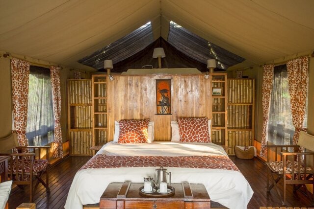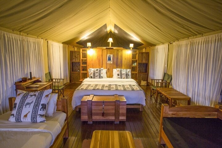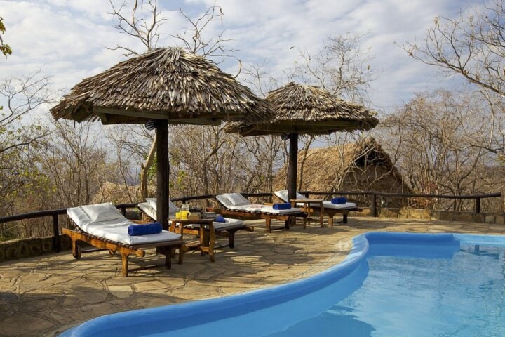 Vuma Hills Tented Camp is perched above the seemingly endless wilderness southwest of Mikumi National Park. The 16 tents are comfortably furnished, with en suite bathroom facilities and shaded wooden verandas. The cozy bar area centers around an open fire and leads onto a large deck from where you can take in the setting sun over the Mkata Plains below. Under the same thatch, the dining area offers wide views through the trees, and the camp has a swimming pool.