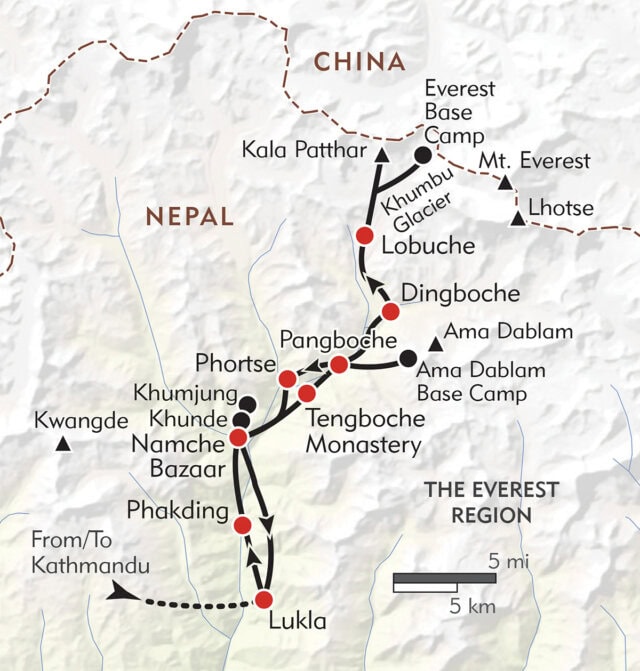 Descend the Khumbu Valley to Phortse, home of the Khumbu Climbing Center, of which WT is a proud supporter. Continue hiking to Namche, then down to Lukla, fly to Kathmandu on Day 17, depart on Day 19.