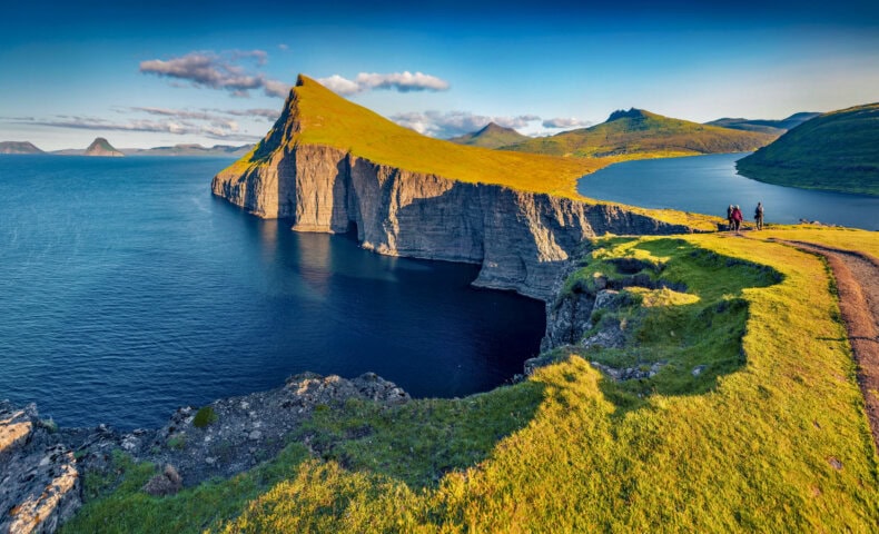 On Vágar, we hike the stupendous cliffs at Trælanípa for a view of Sørvágsvatn, a clifftop lake that seems suspended in the sky. A spectacular ferry ride below Faroese rock formations brings us to Mykines Island, stretching out in a spine of sheer cliff faces. We’ll walk through its turf-roofed village and hike to a puffin colony.