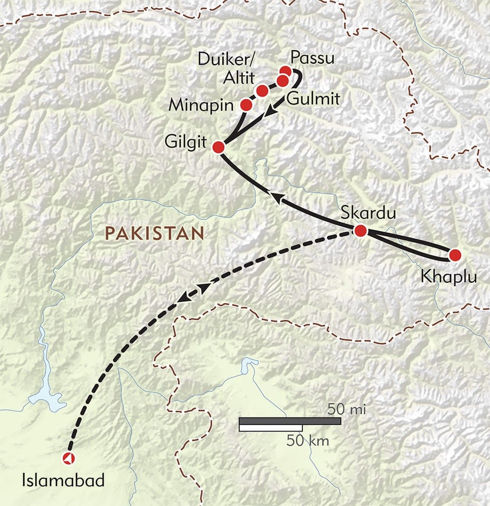Our grand finale is the renowned Hunza Valley, where we’ll visit the Baltit Fort, former residence of the Mir (king) of Hunza, walk along Hunza’s hand-carved water channels, and hike up to the Passu Glacier and 30-mile-long Batura Glacier. We’ll also walk on one of Hunza’s famous hanging bridges. Fly back to Islamabad on Day 15 and depart on Day 17.