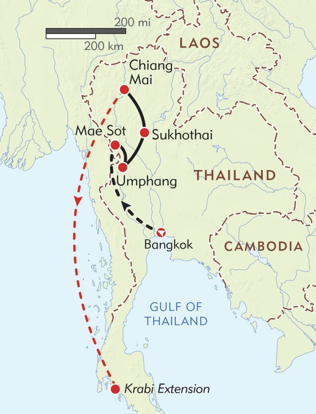 You’ll travel on a variety of modes of transport on your journey, including a private minivan, a songthaew (traditional Thai taxi), and tuk-tuks. On Days 4, 6, 7, and 8, there are drives of 3-4 hours on curving mountain roads. There is an internal flight from Bangkok to Mae Sot on Day 3.