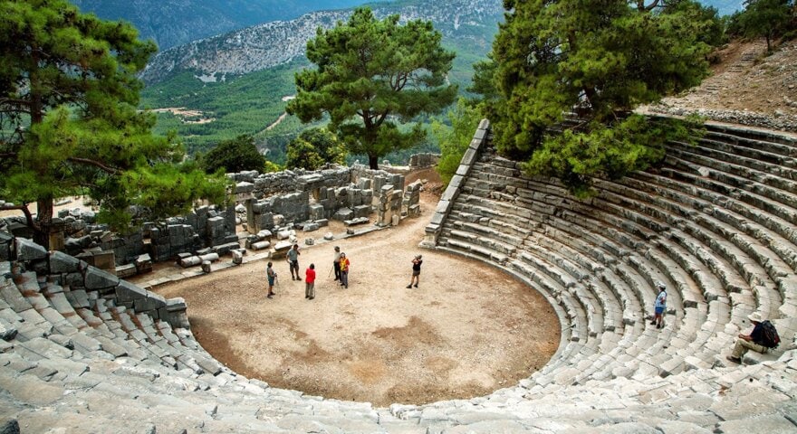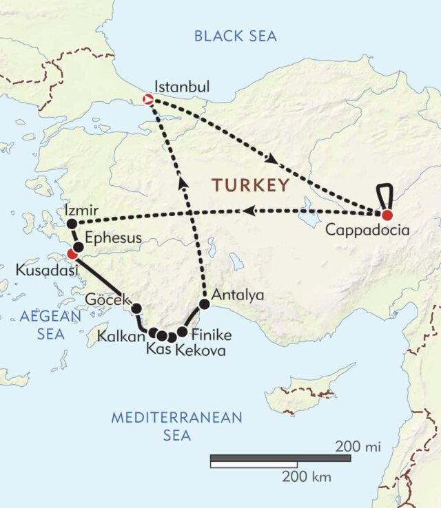 This Private Journey is an inspired Mediterranean sojourn that brings you sunny skies, a warm, translucent sea, pine-forested coasts scented by wild herbs, tiny seaside villages, and a dream world of astounding treasures: rock-cut Lycian tombs, ruined Byzantine monasteries, ancient Roman baths, and towering Greek amphitheaters. Sailing along the exquisite "Turkish Riviera" by private gulet (sailing yacht), you'll head ashore for hikes, visits to archaeological sites, lunch with a farm family in a beautiful pastoral valley, a soak in thermal mud baths, and a chance to witness life in coastal villages. The pace is a relaxed one, with time each day for swimming, snorkeling, and pampering by your chefs, who serve mouth-watering feasts al fresco on deck. You will have a private guide with you in Istanbul, a private guide on the Turquoise Coast cruise, and a private guide in Cappadocia.
