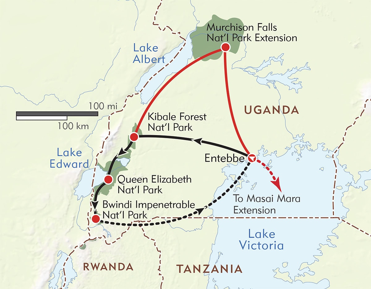 The climate in Uganda is considered “modified tropical”— similar to the equatorial climate of other East African countries like Kenya and Tanzania, but slightly modified by its altitude, which ranges from 3,500 to 4,500 feet. Daytime temperatures are usually in the 70s and 80s, and humidity is fairly high. You can expect to experience some rain during the course of the trip. Like Kenya and Tanzania, Uganda has two annual rainy seasons, one between March and May and one between October and November.