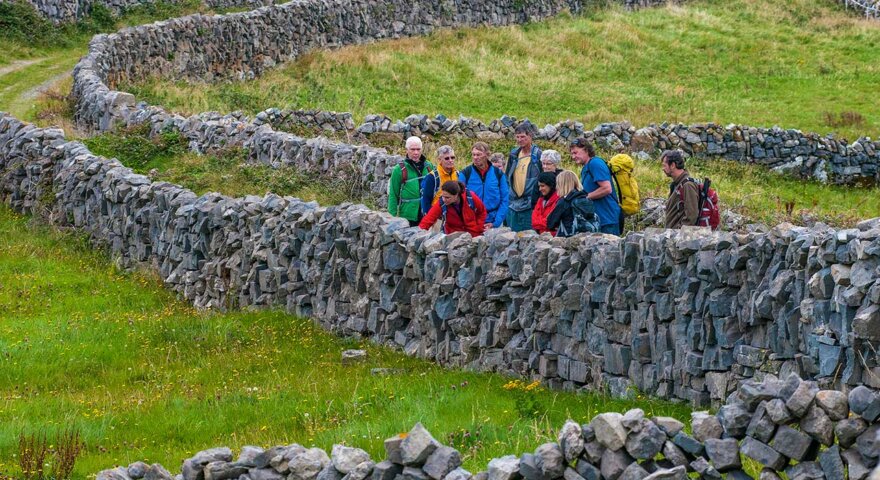 Hiking a pilgrim route into the Maumturk Mountains brings us right to our historic lodge on the shores of Lough Inagh, one of Connemara’s most spectacular lakes. Our next hike is to Killary Harbour and then to the Diamond, one of the Twelve Bens, a range of rocky peaks that provides coastal hill walking at its finest, with magnificent views over the land and sea. On our day trip to the Aran Islands, the film location for The Banshees of Inisherin, we hike majestic sea cliffs that drop straight down to the wild Atlantic below, where Aran Islanders still fish. Depart on Day 9 via Galway.